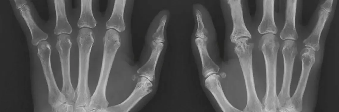 Niekiedy RTG pozwala odkryć również patologie tkanek miękkich w postaci złogów w rzucie przestrzeni podbarkowej – najczęściej są to złogi w kaletce podbarkowej lub w stożku rotatorów w przebiegu wapniejącego zapalenia ścięgien czy entezopatii. W przypadku stawu łokciowego wystarczają 2 projekcje – AP i boczna, ocenia się koncentryczne przyleganie nasad kostnych, szerokość szczeliny promieniowo-ramiennej (norma 2–3 mm), kąt fizjologicznej koślawości (norma ok. 15°) oraz kąt trzonowo-nasadowy (norma ok. 140°) szczególnie ważny u dzieci, gdzie widoczne jest tylko jądro kostnienia bloczka k. ramiennej i wobec zmian tego kąta wnioskuje się o złamaniu nadkłykciowym k. ramiennej. W przypadku nadgarstka stosuje się 2 podstawowe projekcje (AP i boczną) oraz kilka dodatkowych – skośne dla k. łódeczkowatej, w odwiedzeniu promieniowym i łokciowym oraz w pozycji zaciśniętej pięści (zdj. 4).