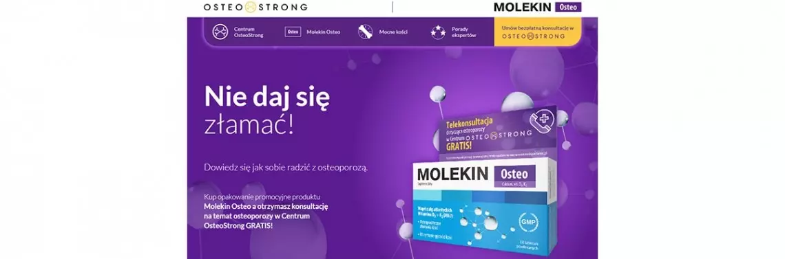 Suplementowi diety Molekin Osteo, który firmuje akcję, towarzyszy hasło „Mocne, zdrowe kości!", a celem producenta jest polepszenie jakości życia kobiet 50+, które zmagają się z osteoporozą i problemami zdrowotnymi z niej wynikającymi. Molekin Osteo zawiera w składzie m.in. wapń z alg atlantyckich, witaminę D3 + K2MK7, które korzystnie wpływają na utrzymanie prawidłowej gęstości kości. Partnerem akcji „Nie daj się złamać!” zostało wywodzące się ze Stanów Zjednoczonych centrum OsteoStrong. Jest to miejsce, w którym fizjoterapeuci do walki z osteoporozą wykorzystują innowacyjne biomechaniczne maszyny Spectrum, przełamując przy tym stereotyp, że mając problemy z kośćmi, należy wystrzegać się wszelkiej aktywności fizycznej. Program ćwiczeń w OsteoStrong realizowany jest pod okiem wykwalifikowanego fizjoterapeuty, który posiada wiedzę z zakresu anatomii, fizjologii, biomechaniki i treningu, dlatego terapia jest całkowicie bezpieczna. „Wiele Pań przychodzi do nas z pewnymi obawami co do ćwiczeń, jednak zawsze powtarzam im, że odpowiednio dobrana forma ruchu korzystnie wpływa na różne aspekty zdrowia, w tym również sprawdza się w walce z osteoporozą" - mówi Aleksander Świątek, fizjoterapeuta pracujący w warszawskim centrum OsteoStrong.