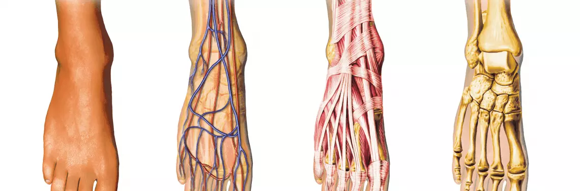 Wieloelementowa budowa stopy stanowi warunek dla „miękkiego” przetoczenia stopy oraz uzupełnia amortyzacyjną funkcję kończyn dolnych. Poniżej przedstawiono zarys budowy anatomicznej stopy. Budowa kostna stopy: